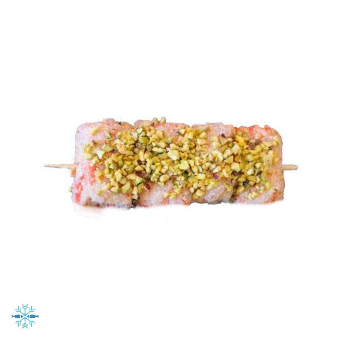 INGREDIENTI: GAMBERONE (Pleoticus muelleri) 67,73%; Pangrattato (farina di GRANO TENERO TIPO 00, acqua, sale, lievito di birra, PISTACCHIO, grana padano, (LATTE, sale, caglio, lisozima (UOVA)),PECORINO ROMANO (LATTE , fermenti lattici, sale, caglio) , olio di semi di girasole, prezzemolo, sale, pepe nero.